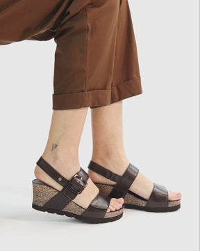 Keilsandalette. Nappaleder in Braun. Klettverschluss. Lederinnenfutter. Anatomisch Innensohle. Leichte, flexible und robuste Sohle aus Kork und EVA. Absatzhöhe: 6.5 cm. 100% Hergestellt in Spanien.
